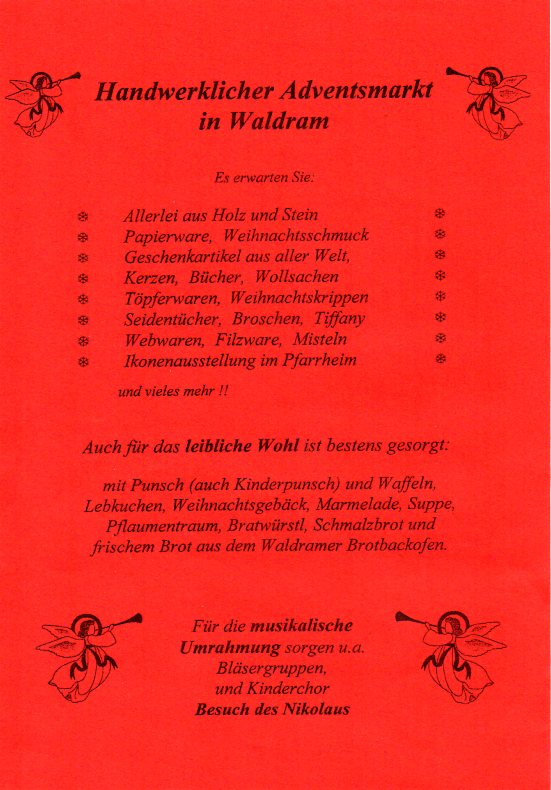 Dort werden wir wieder eine leckere, hausgemachte Gulaschsuppe, Kerzen und auch Krippen aus Israel verkaufen.